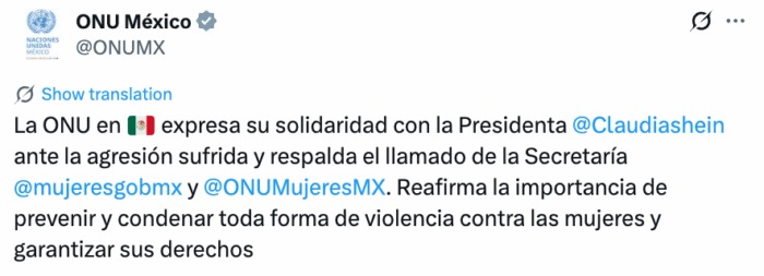 La ONU reiteró su compromiso de acompañar a las autoridades mexicanas en la erradicación de toda forma de violencia de género y en la promoción de un entorno seguro y respetuoso para las mujeres en el ejercicio de sus derechos.
